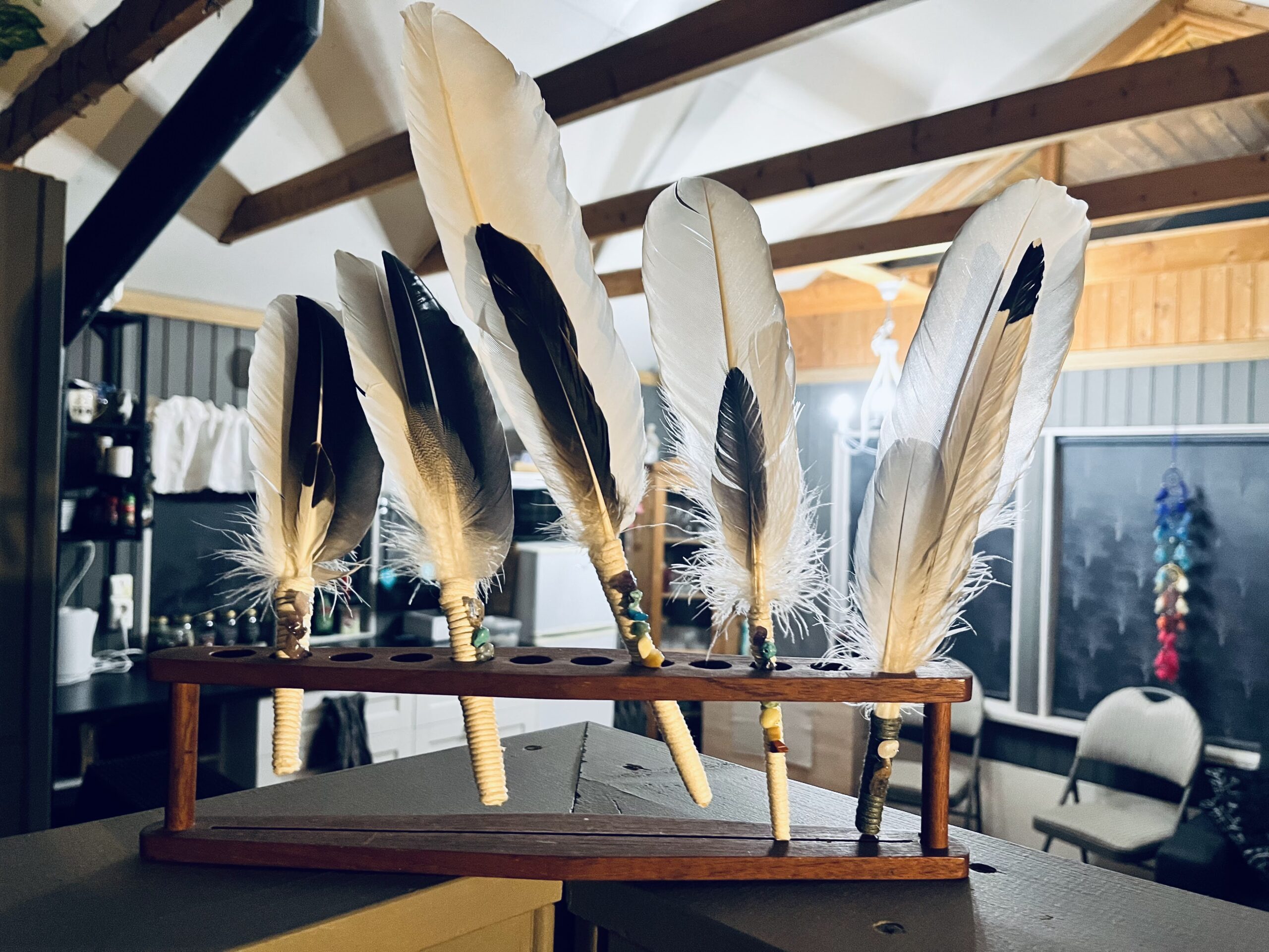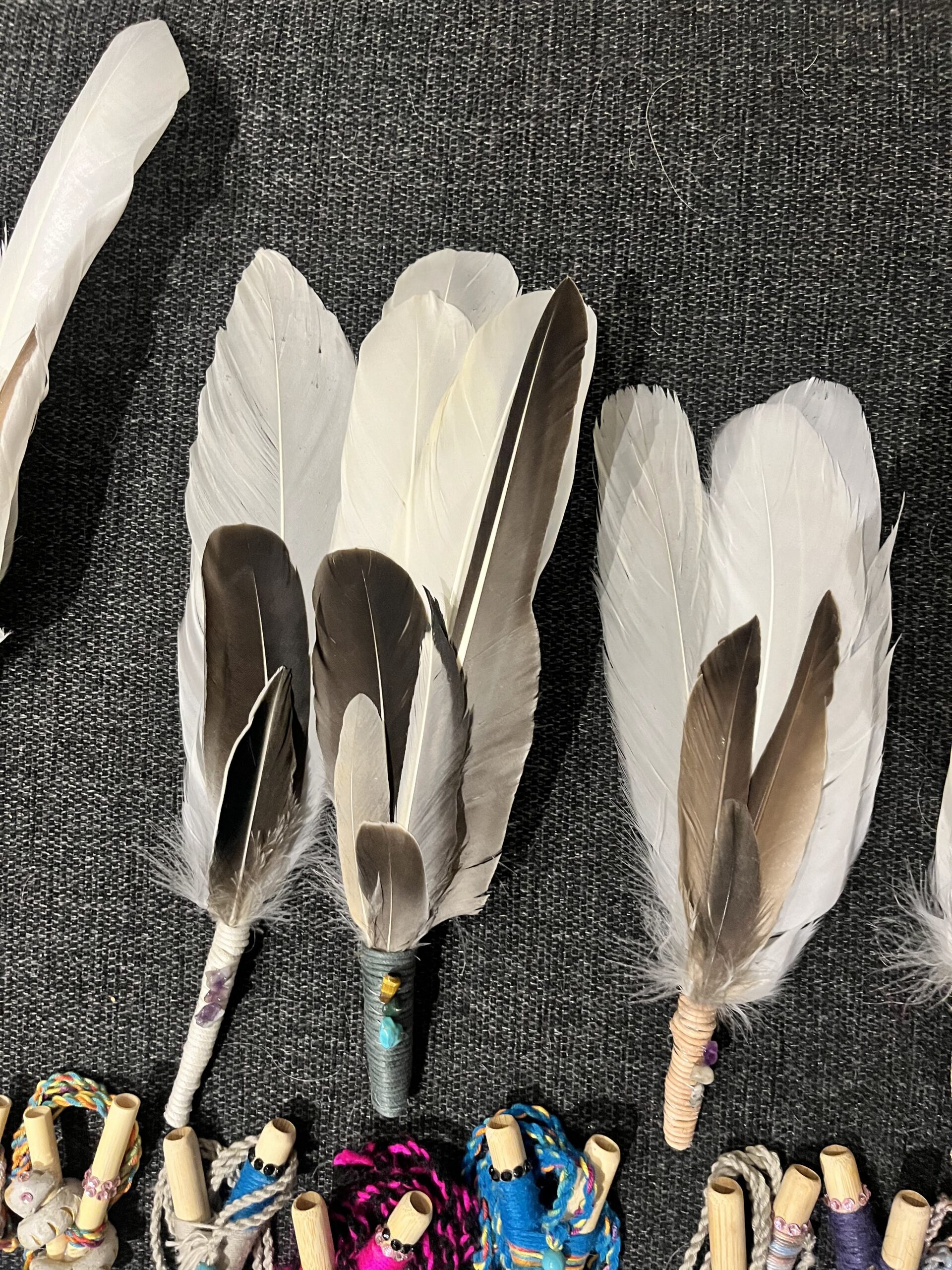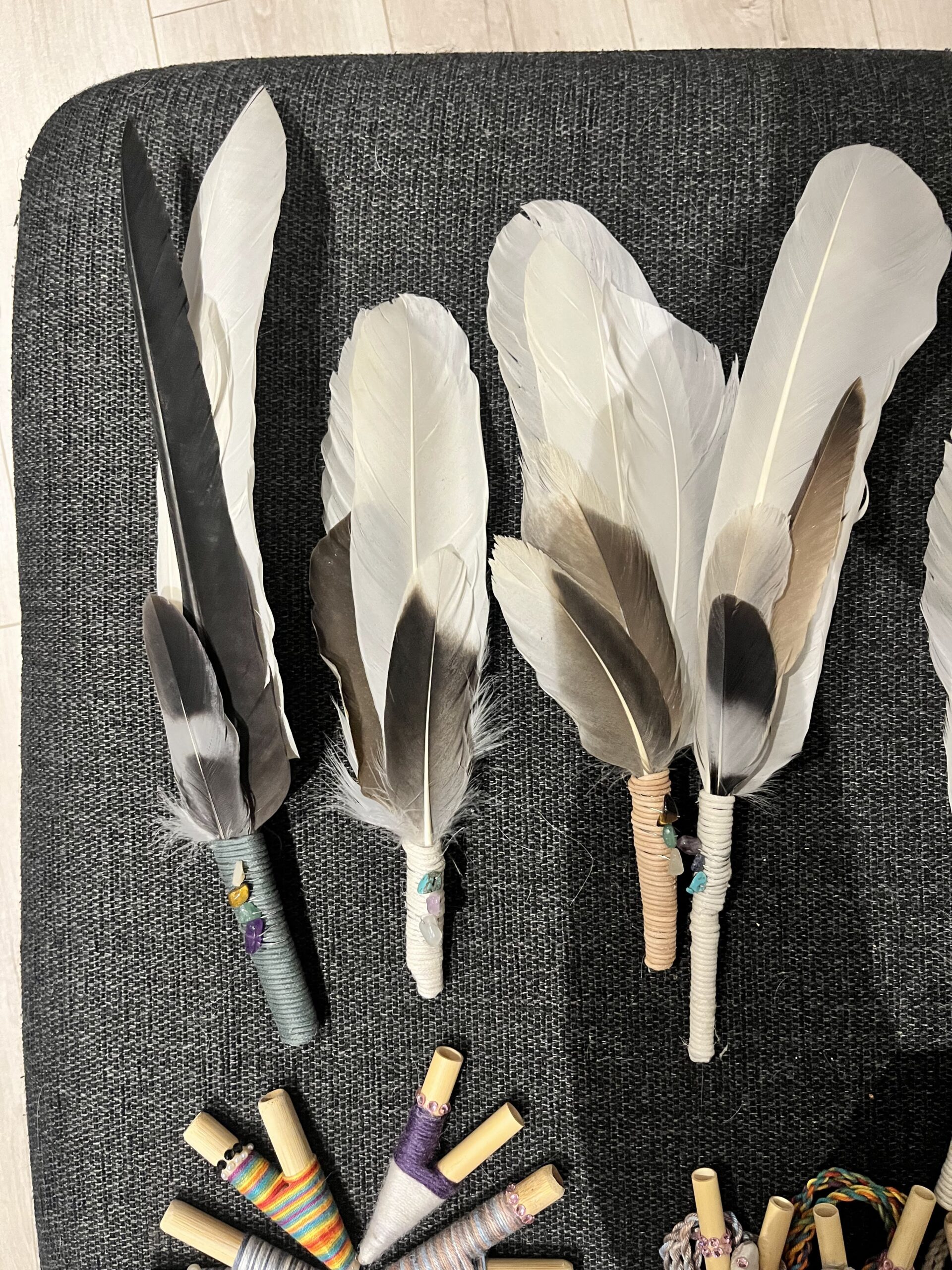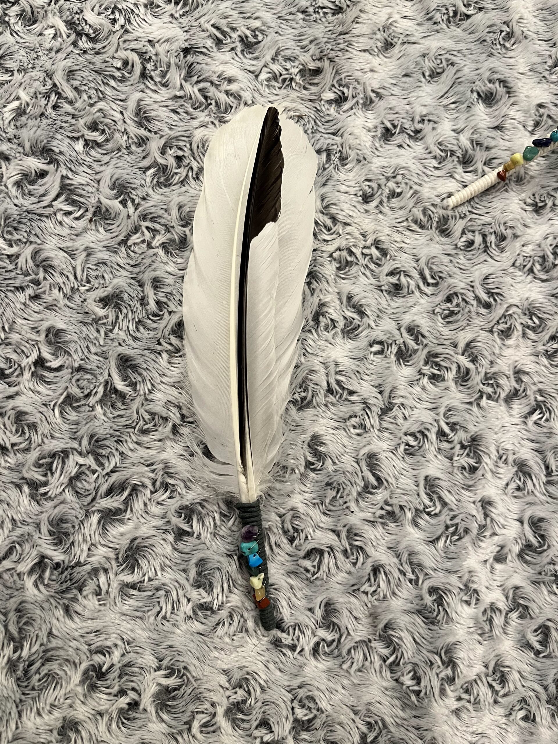 Authentic Icelandic feather wands. Hand picked feathers and put together by Arál with energy stones based on the colours of the chakras. Feather wands are typically used with sage, paulo santo wood or insense to cleanse energies.